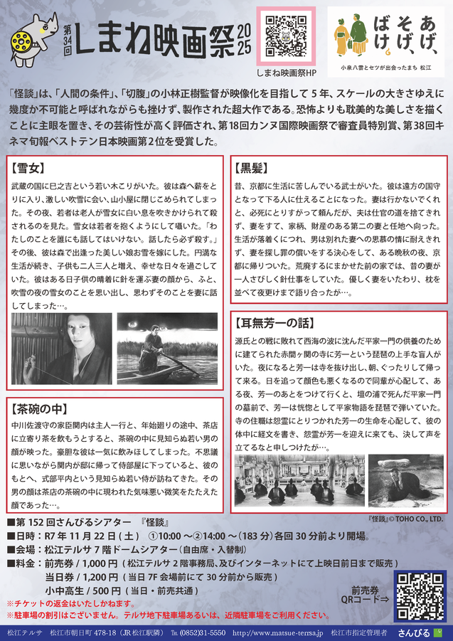 監督:小林 正樹 原作:小泉 八雲 出演:仲代 達矢、丹波 哲郎、三国 連太郎、新珠 三千代 他 |