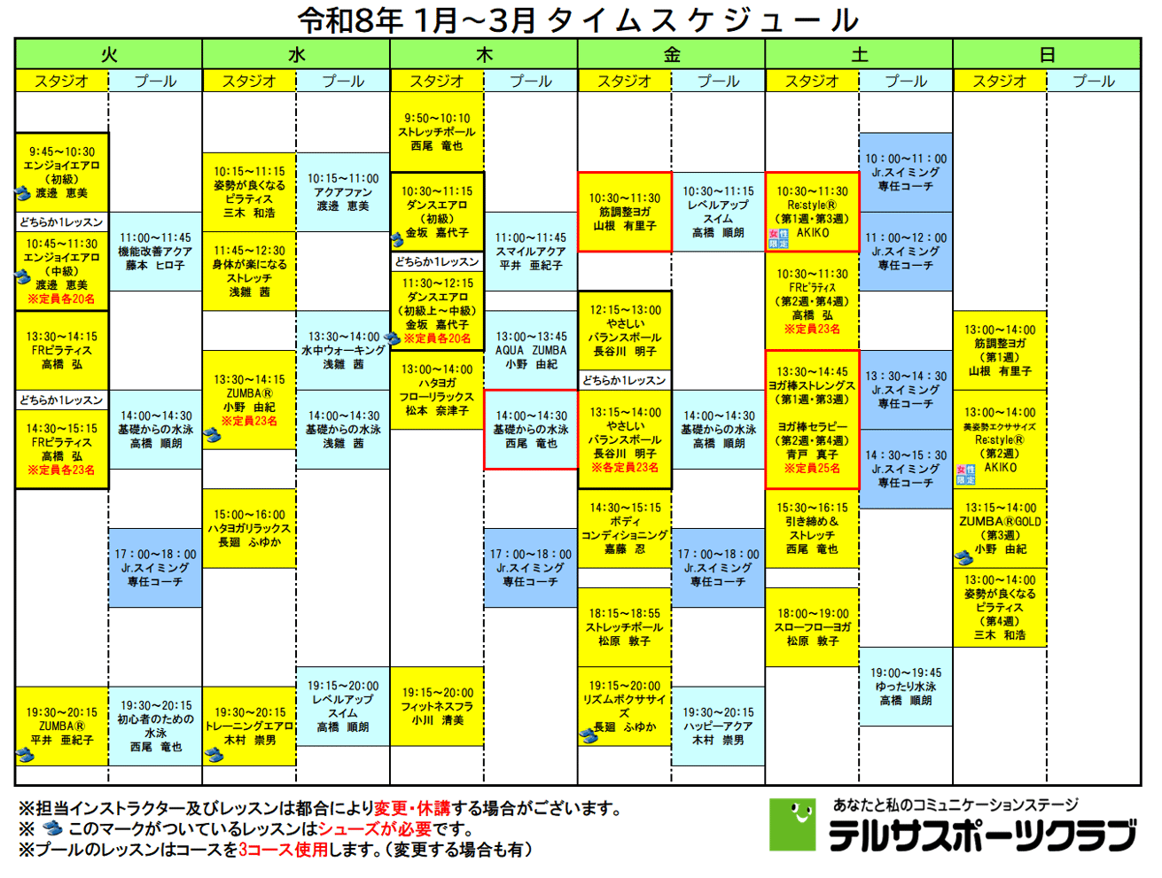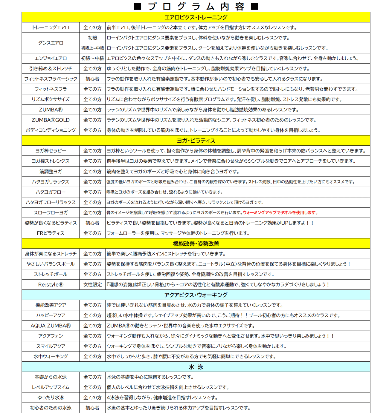 エアロビクス、ヨガ、ピラティス、機能改善系、トレーニング系、スイミング・・・など